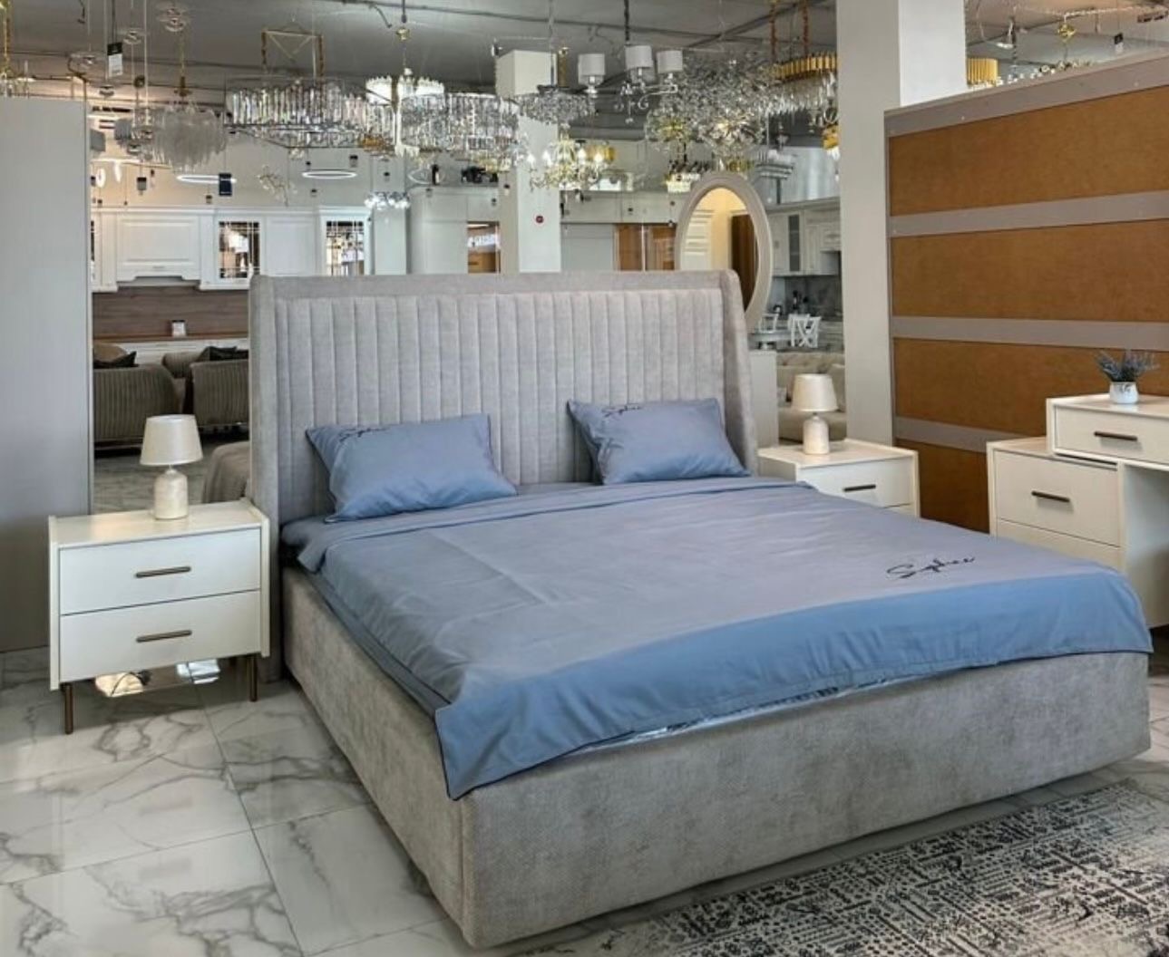 Утончённая кремовая палитра и мягкое серое изголовье создают атмосферу уюта и стиля в вашем доме.